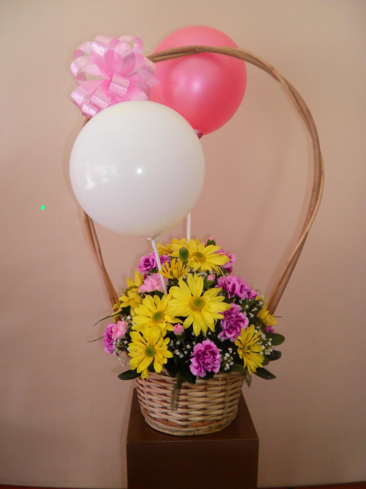 | Cesto de flores variadas, acompañado con globos |